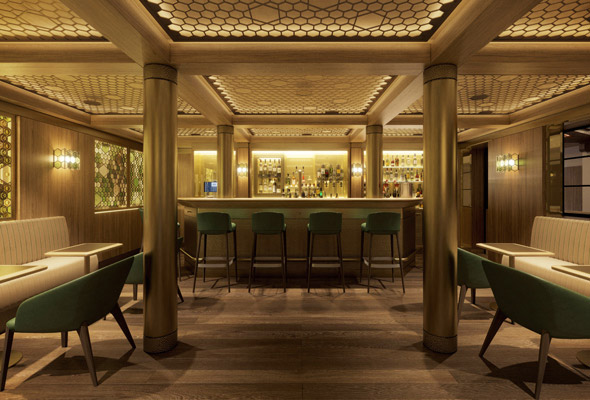 Murnau am Staffelsee. Der Entwurf für das Hotel Alpenhof Murnau umfasst die Neugestaltung der Hotelhalle und der Rezeption sowie das Einfügen einer neuen Hotelbar mit Kaminlounge in den Bestand des Erdgeschosses.