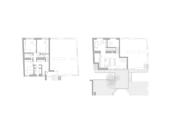 Beschreibung Wien, Große Pfarrgasse. Beim Innenausbau des zweigeschossigen Dachausbaus schafft ein weiß geölter Eichenboden in allen Wohnräumen die Gemütlichkeit in einer minimalistischen Umgebung, Schieferböden markieren viel genutzte Gehwege, die durch bewusst eingesetzte Lichtquellen akzentuiert werden.