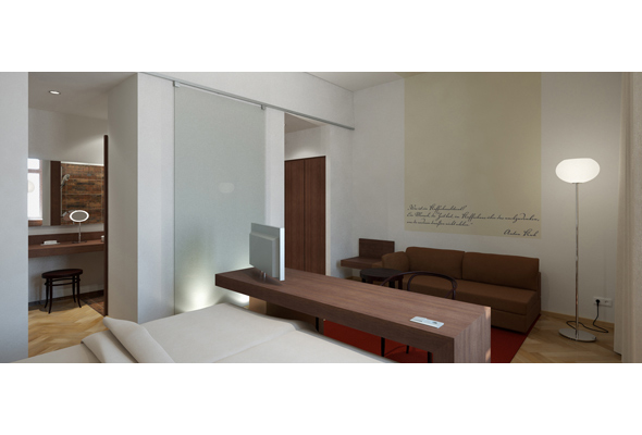 Wien, Herrengasse 10. Das Steigenberger Hotel Herrenhof tritt das Erbe des einst legendären Wiener Cafés Herrenhofes an. Die Eröffnung des von großen, hellen Fenstern geprägten Kaffeehauses war 1918 Sinnbild von Modernität und Offenheit. Inspiriert von diesem Gedanken widerspiegelt der Entwurf Leichtigkeit und Transparenz durch freigestellte Einbauten.
