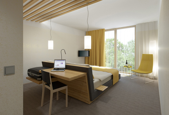 Wien, Schlossallee 8. Das neu errichtete Hotel Schlossallee liegt direkt gegenüber von Schloss Schönbrunn und zitiert im Entwurf für das Interieur der Zimmer mit seinen Gelbtönen das berühmte "Kaisergelb".