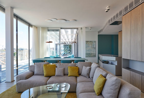 Wien. Von den Grundrissen über die Möblierung bis zur Lichtplanung stammt die Planung von cp architektur. Betritt man die Wohnung, öffnet eine zentrale Blickachse auf die Innere Stadt. Die umlaufenden Terrassen werden durch eine Überdachung geschützt und dienen im Sommer als Wohnraumerweiterung.